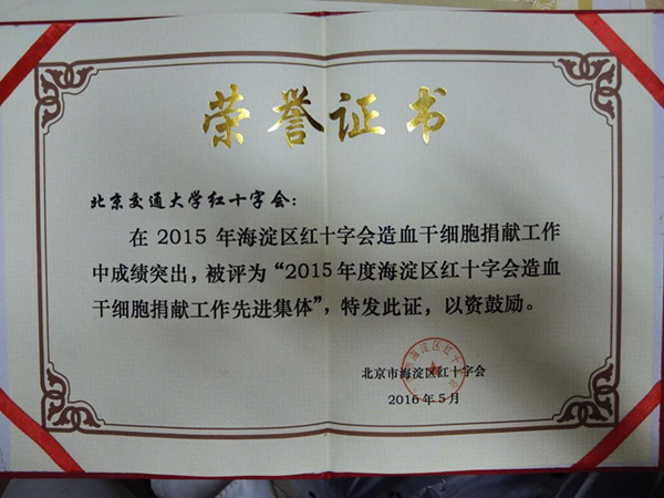 太阳网集团tcy8722红十字会在2015年海淀区红十字会造血干细胞捐献工作中成绩突出,被评为“2015年度海淀区红十字会造血干细胞捐献工作先进集体”