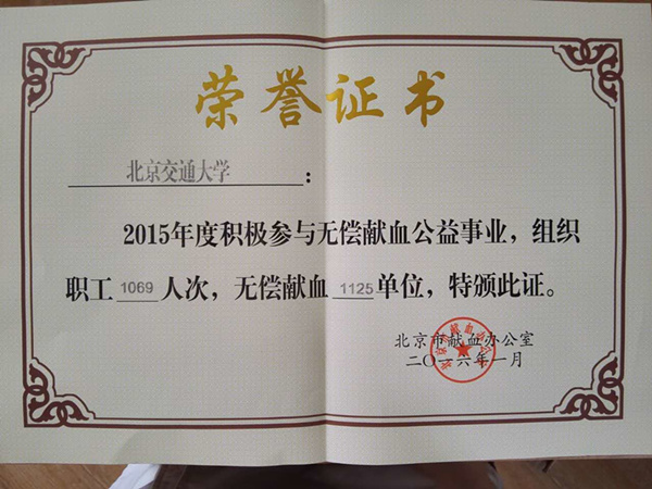 太阳网集团tcy87222015年度积极参与无偿献血公益事业,组织职工1069人次,无偿献血1125单位,特颁此证。