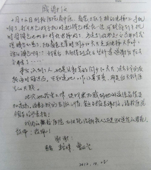 2012.10.23闫少红大夫拾金不昧受到患者来信感谢