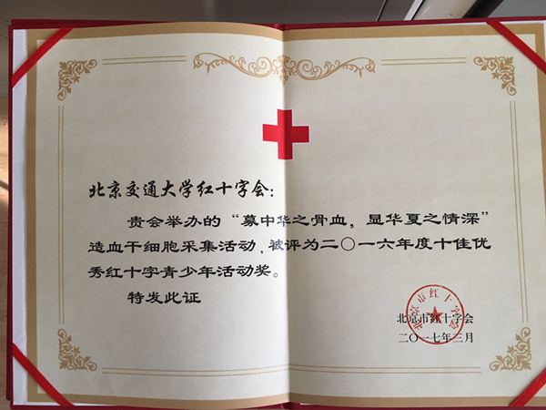 太阳网集团tcy8722红十字会举办的“募中华之骨血,显华夏之情深”造血干细胞采集活动,被评为2016年度十佳优秀红十字青少年活动奖