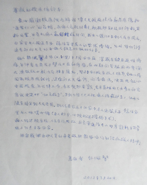 2013.3.20韩佩馨老师来信表达对刘博大夫救死扶伤高尚医德和医者仁心的品格的敬佩