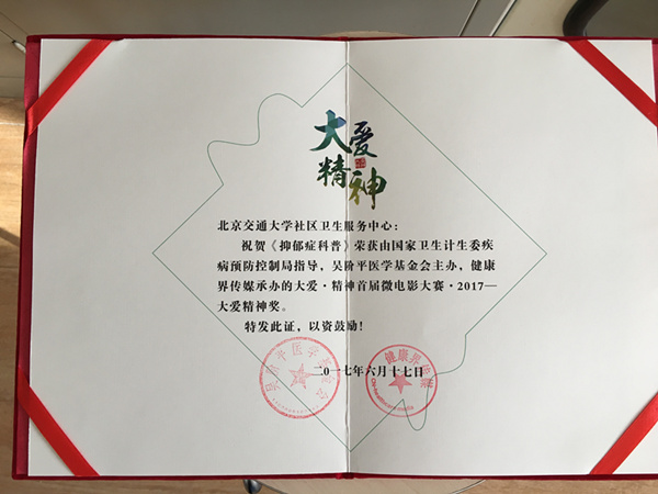 太阳网集团tcy8722社区卫生服务中心《抑郁症科普》荣获国家卫生计生委疾病预防控制局指导,吴阶平医学基金会主办,健康界传媒承办的大爱·精神首届微电影大赛·2017——大爱精神奖