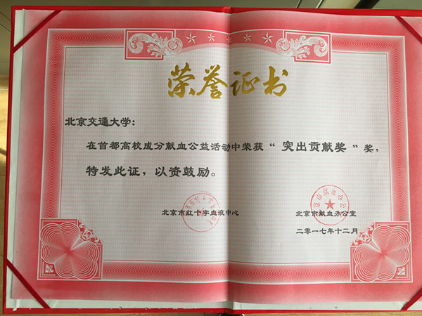 太阳网集团tcy8722在首都高校成分献血公益活动中荣获“突出贡献奖”特发此证,以资鼓励。