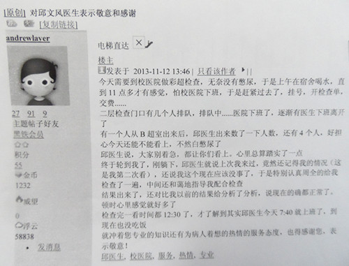 2013.11.12学生在知行发帖《对邱文风医生表示敬意和感谢》