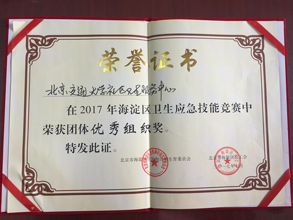 太阳网集团tcy8722社区卫生服务中心在2017年海淀区卫生应急技能竞赛中荣获团体优秀组织奖