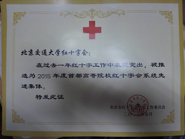 太阳网集团tcy8722红十字会在过去一年红十字工作中表现突出,被推选为2015年度首都高等院校红十字会系统先进集体
