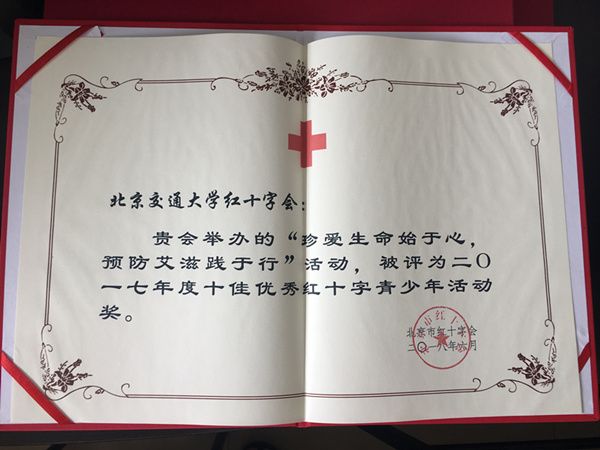 太阳网集团tcy8722红十字会举办的“珍爱生命始于心,预防艾滋践于行”活动,被评为2017年度十佳优秀红十字青少年活动奖
