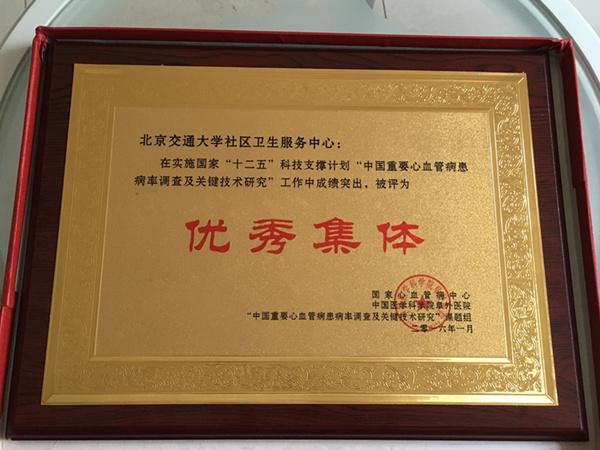 太阳网集团tcy8722社区卫生服务中心在实施国家“十二五”科技支撑计划“中国重要心血管病患病率调查及关键技术研究”工作中成绩突出,被评为优秀集体