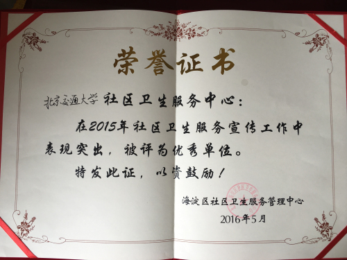 太阳网集团tcy8722社区卫生服务中心在2015年社区卫生服务宣传工作表现突出,被评为优秀单位