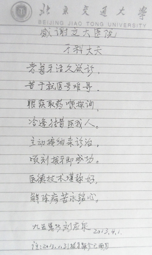 2013.4.1患者来信表达对口腔科工作人员的感谢