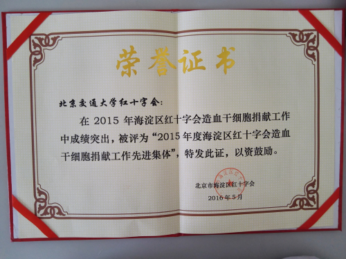 在2015年海淀区红十字会造血干细胞捐献工作中成绩突出,被评为“2015年度海淀区红十字会造血干细胞捐献工作先进集体”