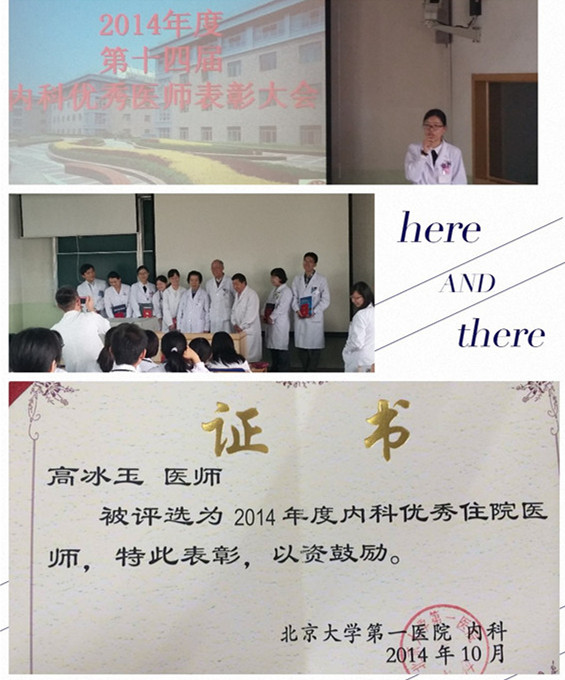 2014年10月24日,我院健康管理中心高冰玉医师荣获北京大学第一医院“内科优秀医师”称号,并在大会上进行了交流发言,为我院赢得了荣誉。高冰玉医师被我院派送去北京大学第一医院进修学习,她年轻好学,虚心请教,认真专研,不断提高自身业务水平,为我们树立了楷模。(唐松梅)