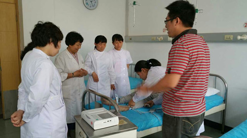 为了使用好新购置的心电图机,护理部邀请了心电图机供货公司有经验的工程师作为培训指导老师。工程师非常认真地为大家讲解了心电图机的性能、操作规程、使用技巧以及故障排除方法等内容。护理部还邀请了一名学生作为被测试者,护理人员在工程师的指导下进行了实战操作,并对心电图进行了分析评价。培训中,培训人员还与工程师进行了互动讨论。