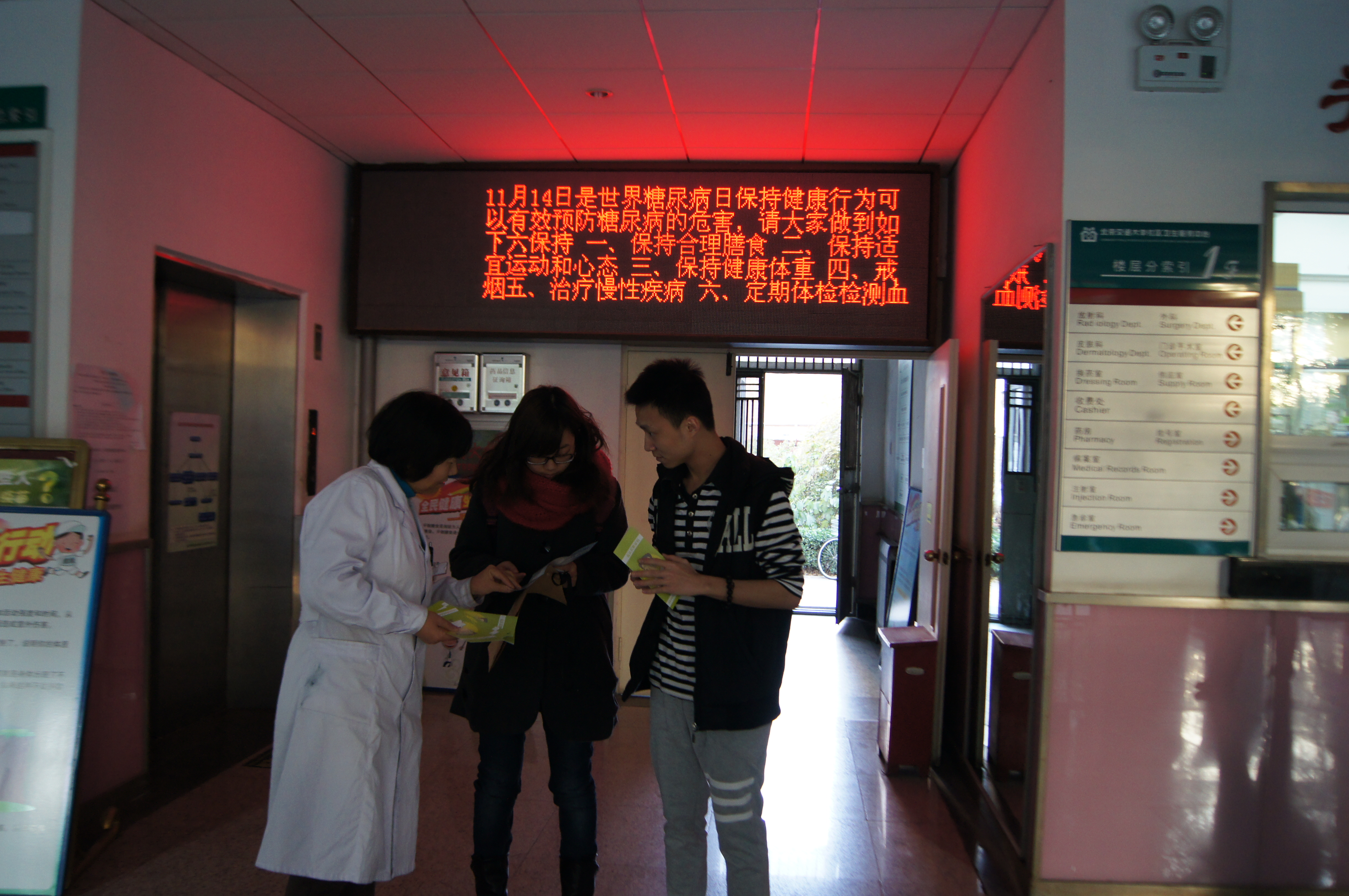 2012年11月14日是世界糖尿病日。今年的口号是“保护我们的未来”。今天早上,太阳网集团tcy8722社区卫生服务中心的医护人员早早在一层门诊大厅摆放展板,宣传健康生活方式,希望大家向合理膳食、适当运动、保持合理体重、放松心情乐观愉快及戒烟限酒等行为方式靠拢,并且在一层大厅的电子公告栏里醒目显示这些内容。告诉大家如何避免糖尿病危险因素对大家造成伤害。积极治疗心血管疾病等医疗保健知识。告诫大家一定要参加每年一次的健康体检并且务必要测血糖、血压,仔细阅读医生书写的体检小结,如有问题及时找大夫咨询并采取相应措施。早防、早治保护我们的未来。