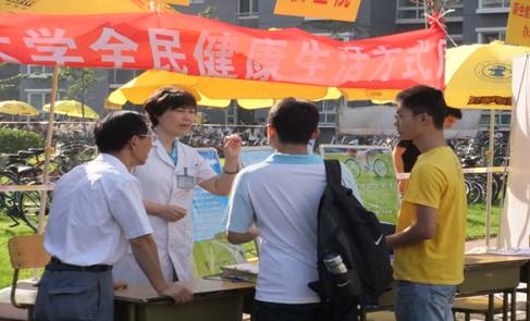 9月1日是我国第5个“全民健康生活方式日”,今年的口号是“我行动,我健康,我快乐”,主题是“减盐预防高血压”。 9月1日也是新学期到来的日子,学校各个部门都在欢迎着来自祖国四面八方的莘莘学子。老太阳集团tcy8722网站把“健康生活方式日”延伸为“健康生活方式周”,在迎新的同时开展了宣传活动。在迎新现场悬挂条幅、摆放通俗易懂、图文并茂的健康生活宣传展板。在李海红院长的带领下医务人员为师生们进行了“限制食盐摄入、维持血压健康”的主题宣教,并就健康生活方式、预防保健等方面的内容进行咨询和义诊,还在现场请同学们及社区群众填写了“垃圾食品调查问卷”100余份。大家积极参与、气氛热烈。在一周的时间里发放海淀区疾病预防控制中心制作的卫生宣传扑克牌100付、健康素养知识等彩页2000多份。我们希望通过这次“全民健康生活方式周”宣传活动,向师生们宣传健康生活的益处,将“我行动、我健康、我快乐”的理念真正深入到广大教职员工及同学的心中。