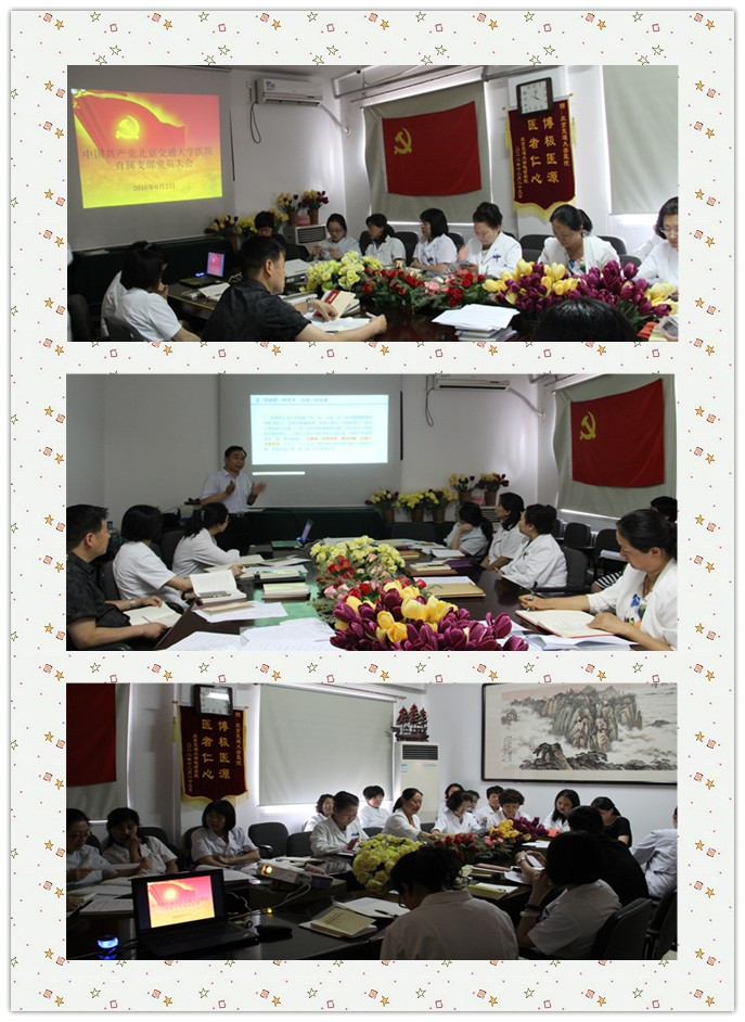 2016年6月2日下午,老太阳集团tcy8722网站直属党支部在医院行政楼三层会议室召开了全体党员大会暨“两学一做”学习交流会,郑广天校长助理莅临会议,医院全体党员参加了此次会议,大会由老太阳集团tcy8722网站直属党支部康俊书记主持。
