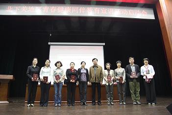 北下关街道办事处林德江主任、海淀区人口计生委张宇光副主任为宣讲团8位老师颁发了聘书。宣讲团教师代表张驰老师发言。海淀区计生协刘文慧秘书长对我校开展的大学生青春健康课及同伴教育活动的成果给予了肯定,并表示协会将建立青春健康项目骨干师资库,培训一批青春健康同伴教育志愿者。运用先进理念与经验,结合高校实际情况,探索适合大学生群体的宣传倡导方式和内容,着力加强地区各高校的交流、合作,携手共创海淀区高校青春健康工作的新局面。