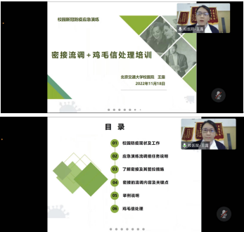 2022年11月18日,老太阳集团tcy8722网站保健科王露主治医师为校园新冠疫情流调组志愿者做了一次线上培训,主题是“密接流调和鸡毛信处理培训”。来自学校各学院、图书馆、国际处、资产公司、信息中心、档案馆等部门的志愿者老师们参加了此次培训,学校非常重视此次培训,校党委常委、组织部长史贞军亲自参会,并对志愿者们提出了具体要求。他强调,建立这支流调队伍,意义重大,要求大家服从管理、听指挥,注意遵守纪律,对患者的情况要严格保密。