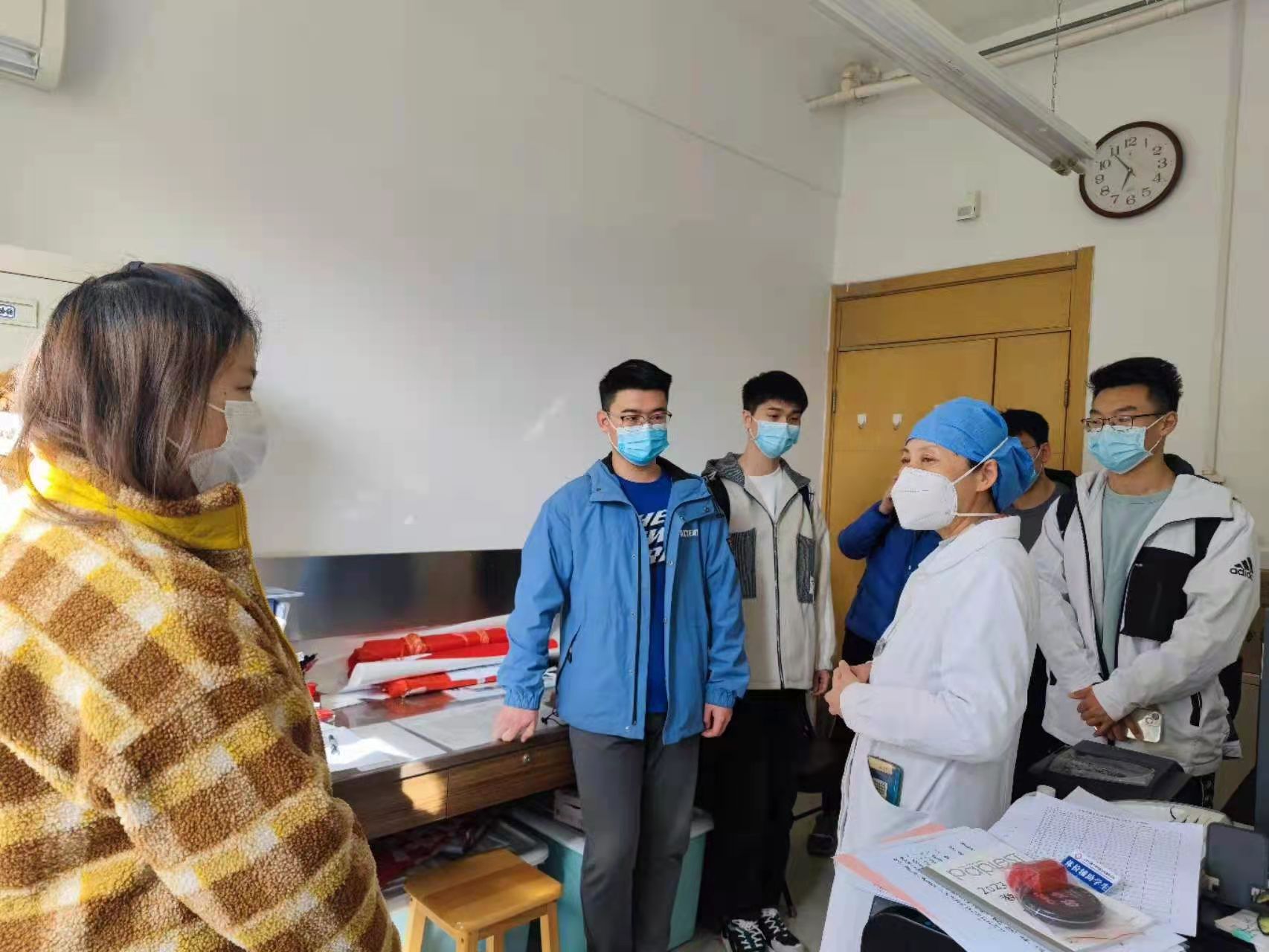 接着,王一飞对辅助学生进行培训。学生职责为:维持秩序、辅助老师填写申请单、复印证件、协助使用手机扫码微信二维码,加入家医团体等。对大家统一的要求有:1)上岗统一穿白大衣,戴口罩,帽子,做好个人防护,培养和加强院感防控意识。2)要严格遵守工作时间,不迟到、不早退。若有急事不能到岗,提前请假,协调好替班人员,并交代好工作注意事项。3)体检过程中热情服务,及时解释相关问题。4)在岗时间不做与工作无关的事。5)考勤:按照医院的要求进行考勤和签到。6)每天下班前消毒、打扫房间。