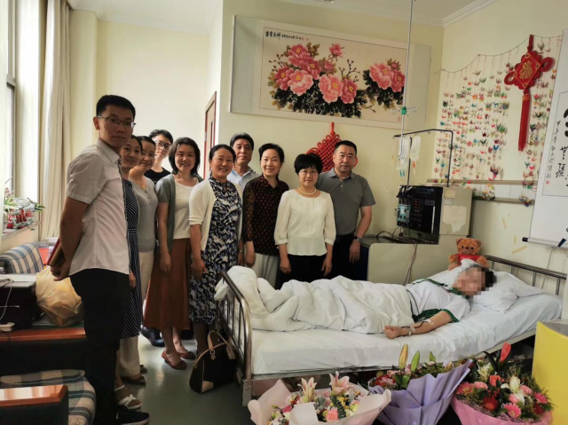 2019年7月18日捐献当天,我校主管学生工作的副校长高艳、电信学院党委书记杨晓晖、电信学院副院长刘颖、老太阳集团tcy8722网站直属党支部书记康俊、小郡的辅导员、班主任和同学们一行前往空军总医院看望小郡,漂亮的小郡,大家被她无私忘我,勇于奉献、乐于助人的精神所感动。衷心的祝愿小郡早日恢复体力,重返校园完成学业。