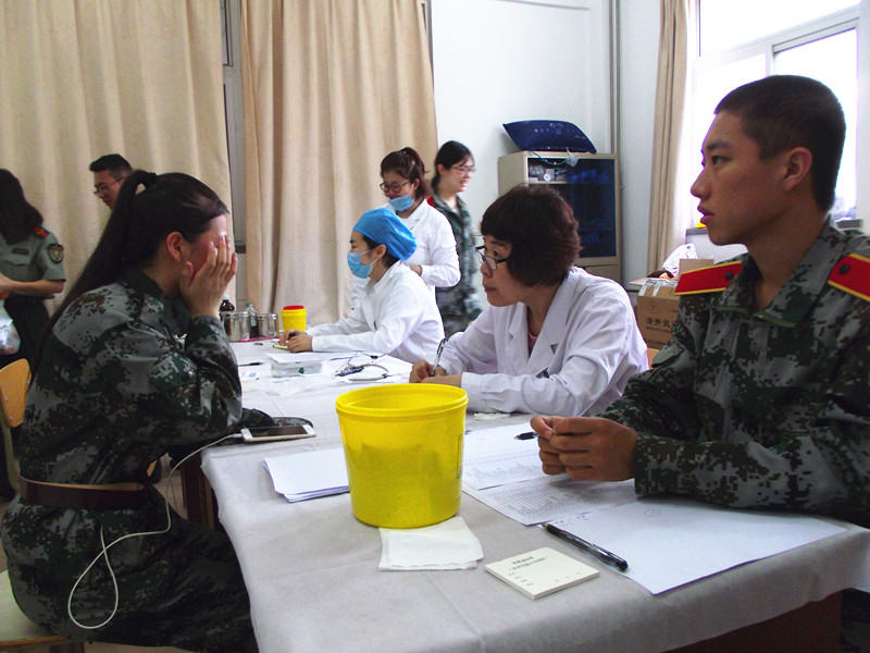 由于怀柔持续高温且许多学生平时缺乏身体锻炼,许多学生在训练过程中与训练后出现了不适应的情况,医务室外面排起了长队。医生们针对不同学生出现的身体问题,务实有效地提出治疗方案,高效率地为学生诊断与开药。