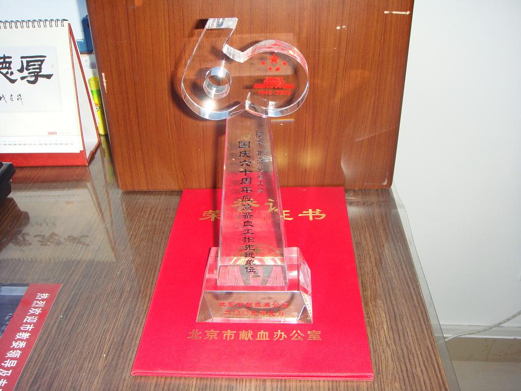 2009年10月16日,北京市献血办公室召开国庆应急备血工作总结会,授予我校国庆六十周年应急备血工作先进单位奖杯和荣誉证书。