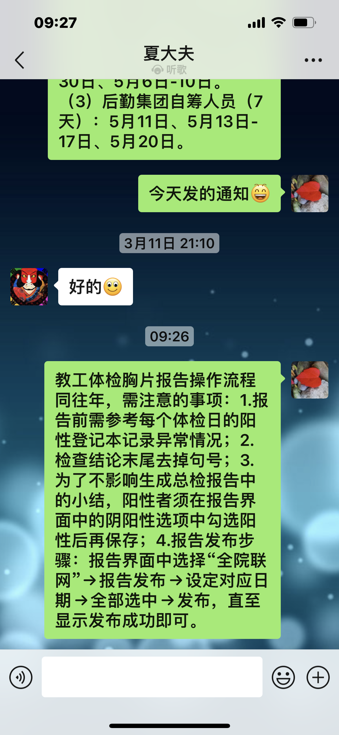 3、外请专家培训:外请专家人员曾多次参加教职工体检培训,为提高培训效率,采取微信线上形式;出具报告操作流程与往年相同,重点对更换体检系统后的新操作进行了着重强调:胸片报告阳性者须在阴阳性选项中勾选阳性后再保存,否则无法生成总检报告中的小结。