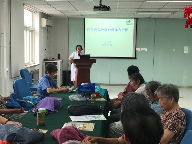接着,糖尿病小组负责人赵春丽医生对本年度的小组活动做了总结。她说,半年来我们主要围绕糖尿病的“五驾马车”理论展开综合性的控糖宣教。其中包含了二层含义:第一、糖尿病的治疗是包括饮食控制、运动、血糖监测、糖尿病自我管理教育和药物的综合治疗;第二、对大多数的2型糖尿病患者而言,往往同时伴有如高血压、血脂异常、超重肥胖等多种疾病,所以降糖同时应包括降压、调脂的综合治疗。老年人的肌肉组织在逐年递减,今年糖尿病小组重点向大家推广了弹力带操,希望大家掌握好弹力带操并能坚持练习。它简便易行,经过我们多次血糖检测,降糖效果肯定,大家坚持锻炼一定能从中获益。