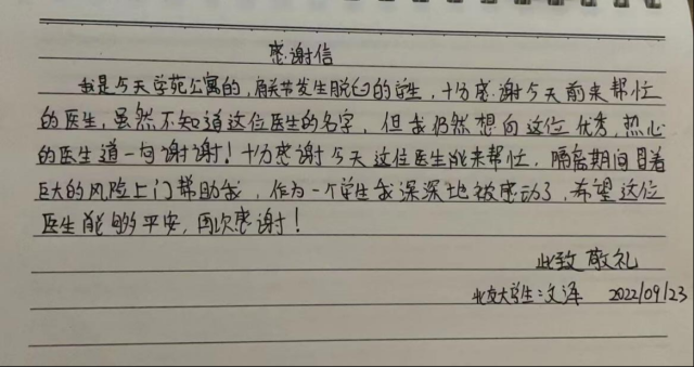 “隔离期间冒着巨大的风险上门帮助我,作为一个学生,我深深地被感动了,希望这位医生能够平安,再次感谢!” 这是一封来自学苑公寓9号楼正在隔离期间的同学的感谢信片段。简短朴实的话语,却盛满了同学发自内心的感谢之情,也表达了这名学子对帮助自己医生的暖暖谢意。