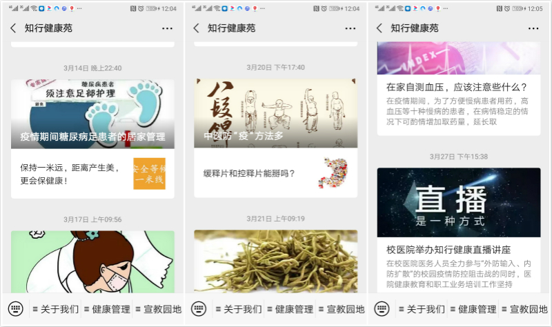针对疫情期间的特点,分阶段、有重点地开展健康宣教。各团队立足本领域,针对居民关心的健康热点撰写科普文章;针对各科室常见病、多发病,进行疫情期间自我保健知识的传播;针对高校特点,开展大学生和教职工网络教学期间常见问题的健康指导。除疫情相关的健康科普宣传外,也不放松各种卫生日的宣传,通过网络开展更大范围的科普宣传。