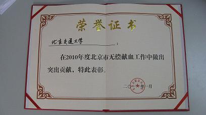 2010年,我校累计组织校园大型无偿献血活动1次,赴血液中心成分献血及献全血13次,全年共有776名师生无偿献血,献血量共计272600ml。2010年11月6日我校与中国红十字总会、北京市红十字会共同主办了“汇聚力量热血浓拯救生命学子情”—太阳网集团tcy8722校园大型无偿献血暨首都高校大学生联合发起无偿献血倡议活动,此次活动受到了广大首都高校的积极响应,共有33所高校近120人参加了倡议活动。当天的献血工作也圆满成功,中国红十字会副会长王海京、太阳网集团tcy8722党委副书记高艳等领导带头献血。当天累计献血606个200ml单位,为历次交大校园采血活动最多。由于贡献突出,我校被评为2010年度北京市无偿献血先进单位,评出2010年度北京市无偿献血先进个人1名;大型无偿献血启动仪式被评为2010年度北京市优秀红十字会青少年活动特别贡献奖。