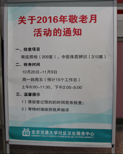 2016年的重阳节是我国政府提倡的第七个敬老月,为弘扬中华民族尊老、爱老、敬老的传统美德,学校决定在今年“敬老月”期间,开展离退休老同志眼底照相和中医体质辨识工作,为老同志早发现、早治疗疾病提供服务。金秋十月,老太阳集团tcy8722网站与离退休工作处联合开展了学校“敬老月”活动。