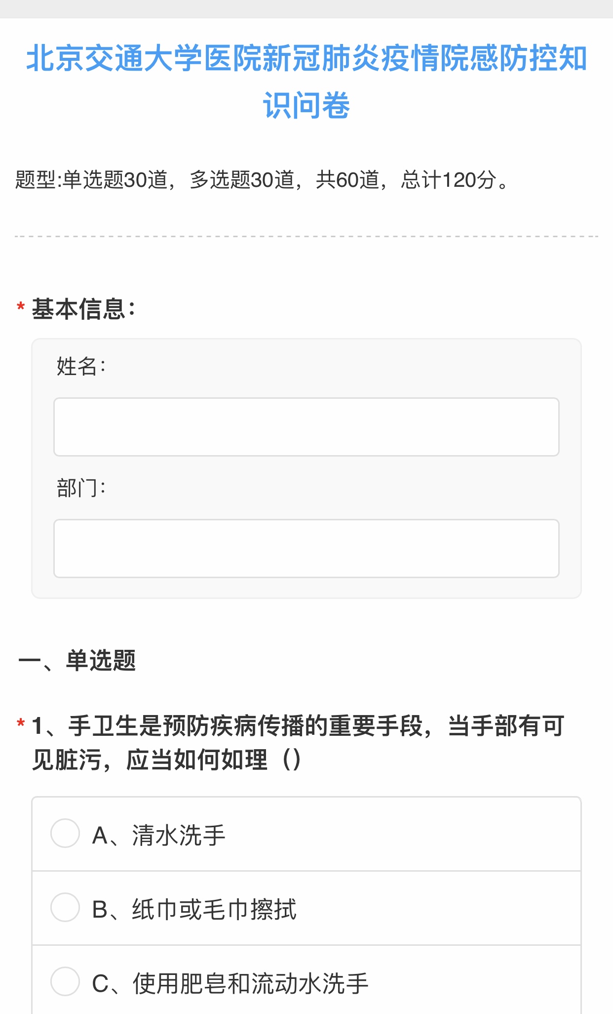 根据中心在新冠疫情期间医院感染管理与控制的要求,问卷试题主要从手卫生、标准预防、消毒隔离、医疗垃圾的处理、新冠肺炎防控的相关知识进行选题,并将最终得分与个人绩效考核挂钩。负责全中心医院感控的护士长田英杰与业务副主任卢云涛经过多次沟通,从数百道试题中选择与当前疫情形势、日常工作联系紧密的题目60道,满分120分,由护理部刘薛静制作成“问卷星”进行全院学习培训。