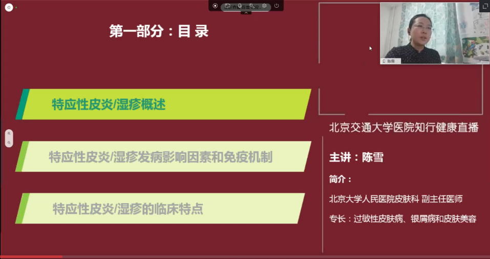 讲座的第二部分我们请到了北京大学人民医院的专家陈雪博士为我们讲解《特异性皮炎/湿疹基础和治疗现状》。许多患者面临着春季过敏性皮肤疾患的困扰,陈雪博士在直播中向大家详细讲解了特异性皮炎/湿疹的发病影响因素、免疫机制以及临床特点等,教会公众针对春季最常见的一些皮肤疾病如何预防和正确治疗。在直播尾声设计的在线咨询环节,陈雪博士现场解答了在线嘉宾的问题,还一一回答了直播过程中线上观众提出的咨询问题。相信经过陈雪老师的讲解,大家能够更加从容地应对春季过敏性皮肤疾患,提升健康素养和水平。