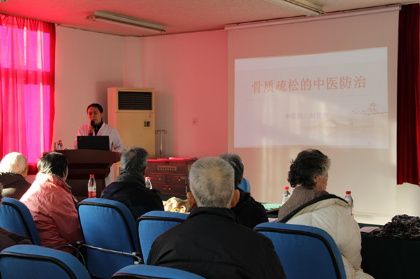 中医科张秀娟主任负责具体负责实施。张秀娟主任对活动的每一个步骤和细节都进行了仔细的准备和布置,还设计了“义诊取号卡”方便居民义诊。首先进行的是健康讲座活动,由中医科主治医师刘延青医生主讲。主要内容为《骨质疏松的中医防治》,为社区居民普及了骨质疏松的病因、常见证型、以及如何利用中医药方法防治骨质疏松症的相关知识。有约50余名居民到场参加了讲座活动。活动过程中听的十分认真,一些居民甚至根据刘大夫的讲座内容详细地记了笔记。讲座结束后开始义诊及咨询,由外科专业背景的孔令伟院长、内科专业背景的卢云涛、刘红军两位副院长、中医专家梁汝成老先生、李明副主任医师及中医科的全体医生为辖区居民分别进行了外科、内科及中医科义诊活动。另外,中医科也准备了“中医体质辨识”,“骨质疏松症——正确认识,科学防范”等宣传折页手册于活动当天在会场外发放,帮助参与活动的社区居民更好地了解相关知识,义诊活动进行的顺畅、圆满。
