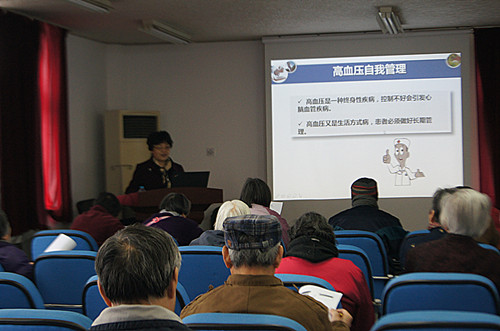 为了增强社区居民及家庭保健员的自我保健和健康管理意识,提高对高血压的认识和自我管理的水平,2015年4月2日上午,老太阳集团tcy8722网站在健康教育室举办了《一起认识高血压》的健康知识讲座。由健康管理中心主任医师常玲授课,她从高血压的成因、判断、种类、临床表现、常见并发症、日常合理用药讲起,着重深入细致地讲解家庭自测血压及测量的时间注意事项以及高血压防治等问题,告诉大家高血压病的自我监测和管理意义重大,对控制血压会起到事半功倍的效果;提醒大家要注意对身体的定期检查,学会与大夫交流互动,合理就医;平时要养成良好的生活习惯,推荐食物多样、谷类为主、低盐、低糖、低脂的健康膳食、适量运动、戒烟限酒、控制体重、保持良好的身心状态。
