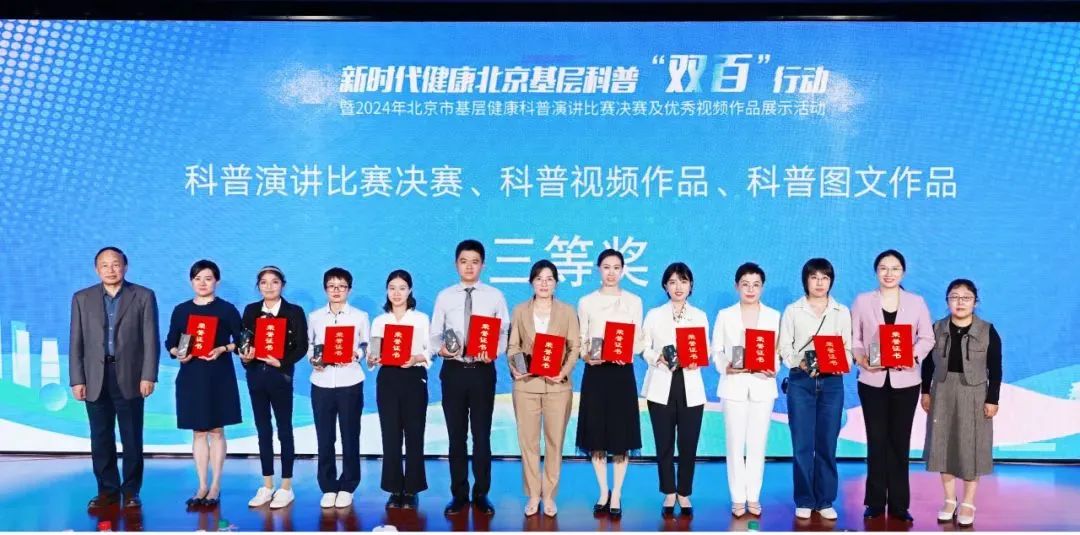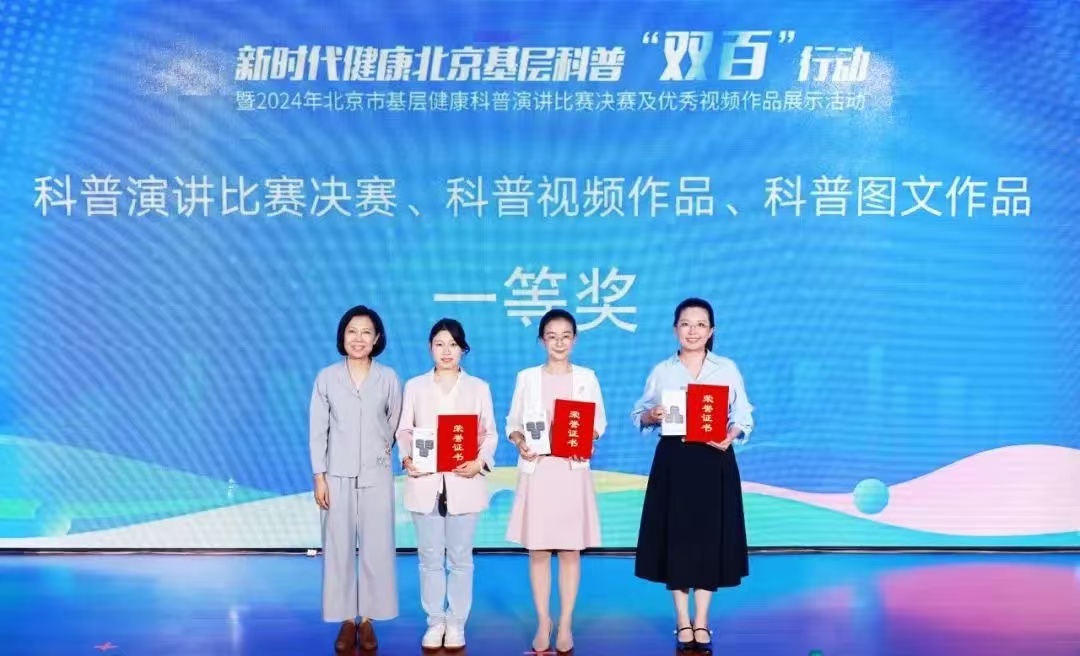 2024年10月10日,新时代健康北京基层科普“双百”行动暨2024年北京市基层健康科普演讲决赛及优秀视频作品展示活动在朝阳区潘家园街道社区综合体成功举办,经过激烈角逐,我院程珏医生以“爱牙护龈用牙线”主题演讲脱颖而出,荣获一等奖,杨树琳医生的“HPV疫苗,您选对了吗?”主题演讲获得三等奖。杨树琳、卢云涛、刘延三位医生录制的科普视频“科学管理更年期、安享健康与美丽”获得视频类二等奖。程珏、杨树琳两名医生获得“百名基层健康科普优秀骨干”称号。