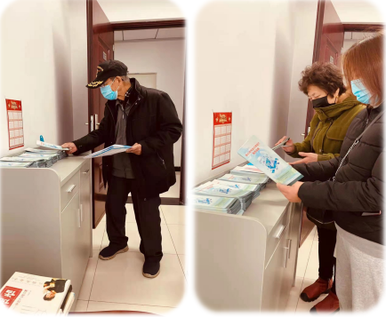 正逢离退办在组织民主选举及防疫物资的发放,借着这个大批老同志来离退办的机会,退办的工作人员在会议室的门口排放好了折页。老同志们纷纷取拿学习并感谢我们的贴心制作。