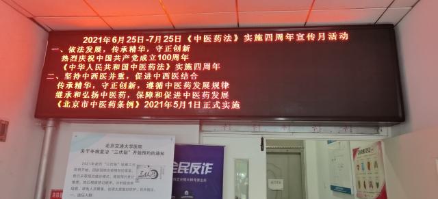 3.创新宣传手段,丰富宣传形式。宣传月开展以来,我中心结合实际,采取多种方式开展集中宣传,形成持续宣传热潮。一是精心印制宣传材料,深入解读《中医药法》、《北京市中医药条例》的精神内涵。二是在门诊大厅及三楼中医馆摆放宣传海报。三是利用宣传栏、电子屏等平台滚动播放宣传内容,提升宣传效果。(迟文)