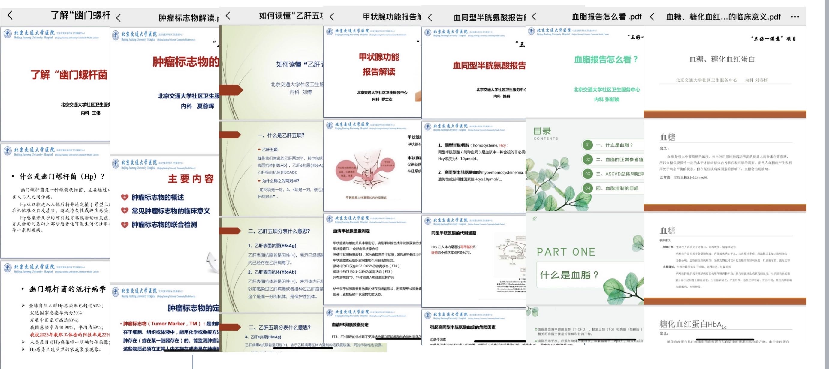 2023年内科“三好一满意”活动的主题是“帮助教职工了解体检项目的临床意义”。今年体检结束后,内科的医生们就特别关注了临床反馈。经过一段时间的数据积累,发现老师们对肿瘤标志物、血脂、血糖、甲功、同型半胱氨酸、幽门螺杆菌感染、乙肝抗体等项目关注度较高。针对上述项目,内科医生们全体总动员,利用自己的业余时间查阅指南、文献,并结合我校的体检项目进行了精心准备。在保证内容科学精准的前提下,尽量避免使用一些特别专业的医学术语,使用更通俗易懂的语言方便老师理解。采用PPT的形式,应用简捷、精美的画面、易于滑动的PDF界面,给老师们展示了教职工体检主要项目的内涵和常见问题解答。期望老师们阅读后,能都正确解读体检报告,消除体检后的焦虑情绪。