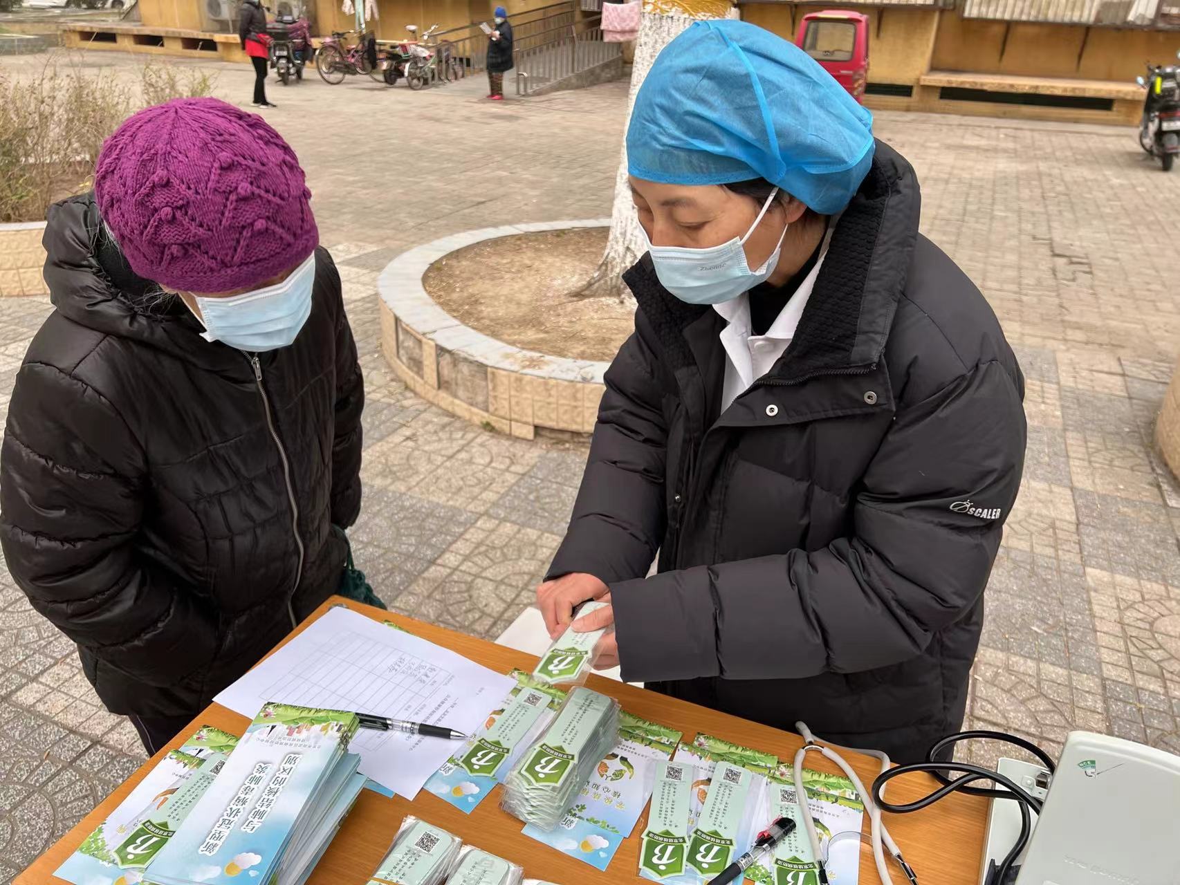 3月24日下午,我中心保健科崔惠景、李素英医生和健康管理中心王一飞护师在我院对面的社区小广场上,为我校师生及社区居民开展了现场宣传活动。活动中,医护人员围绕今年的宣传主题——生命至上 全民行动 共享健康 终结结核,讲解了结核病相关防治知识,发放了“北京结核病防治”书签、“学校结核病核心知识”宣传册及“新型冠状病毒肺炎与肺结核的区别”折页等宣传材料。初春的北京,虽然天气寒冷,但居民们的参与热情一点没有受到影响,积极参与活动并给予了一致好评。本次活动发放了书签、折页等宣传资料共计400余份。