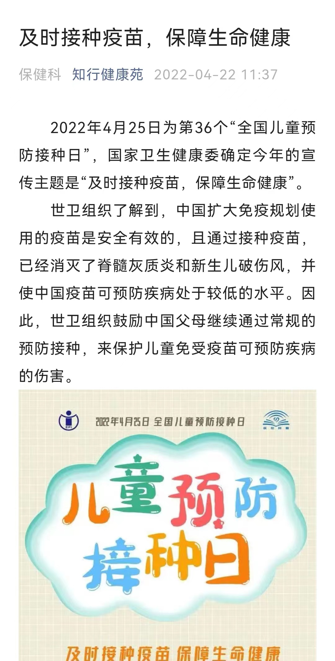 每年的4月25日,既是广大儿童的节日,也是全国计划免疫工作者的节日。今年,我们迎来了第36个“全国儿童预防接种日”,今年的主题是“及时接种疫苗,保障生命健康”。