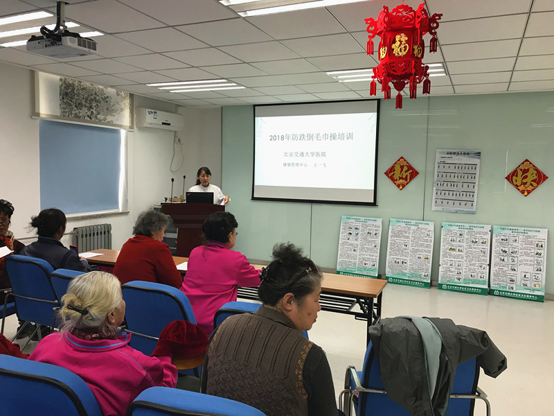 为了落实上级的这些利国利民的倡议和要求,2018年3月26日下午,老太阳集团tcy8722网站举办了“老年人防跌倒毛巾操”的宣传推广及培训活动。在医院门诊楼三层健康教育室,健康管理中心主任聂颖副主任医师向大家介绍了“老年人防跌倒”的重要性。她提到,前几天夜班时,就连续遇到两位学校的老人发生跌倒,一位是摔在楼下的台阶上,导致后脑部损伤,另一位是在家中床边滑倒,前额磕在了床头上,裂了大口子,两位患者都连夜紧急送往人民医院救治了。她从医学角度分析了老年人骨质的特点、易跌倒的原因,用事实证明防跌倒的重要性。接着王一飞主管护师,解读了海淀区疾控中心对组建防跌倒毛巾操的各项要求及实施计划。随后,她播放了毛巾操的视频,又将悬挂的毛巾操的挂图向大家做了讲解。