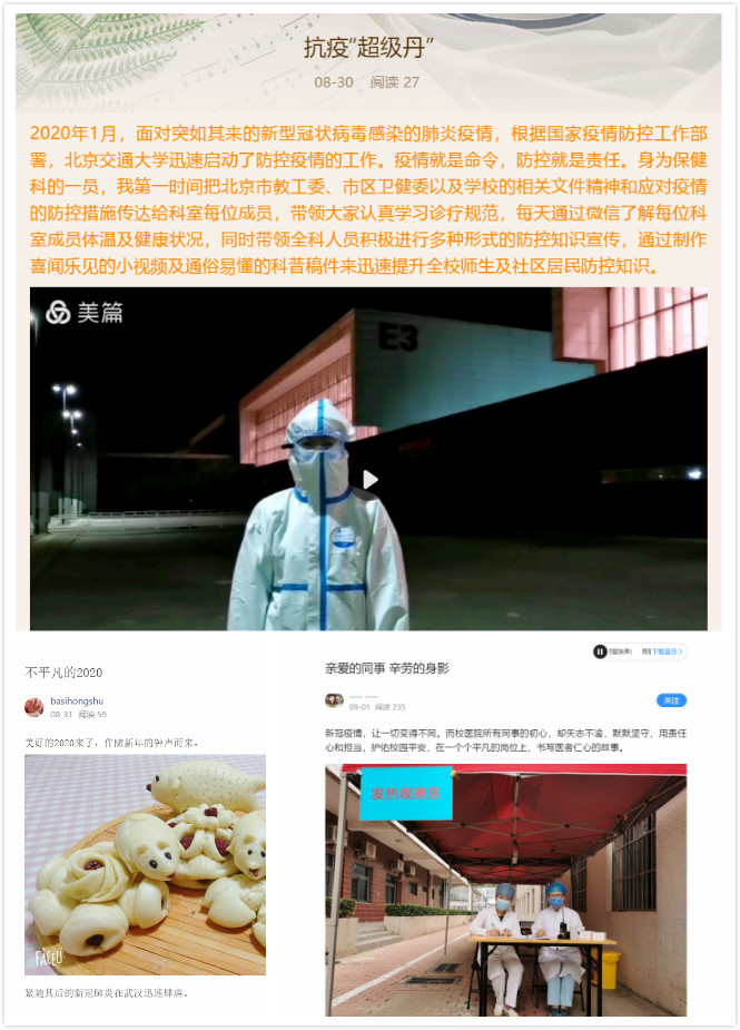 活动得到了大家的积极响应,大家采用视频、照片等图文并茂的形式创作作品。提交的作品中既有参与疫情防控的全院、科室、个人的“战疫故事”,也有感动中国和世界的抗疫大事记。经评选,记录我院医生参与首都机场转运一线工作的“抗疫超级丹”、记录医院职工抗疫身影的“亲爱的同事,辛劳的身影”、记录科室“战疫”工作生活缩影的“不平凡的2020”得到了评委们的一致好评。