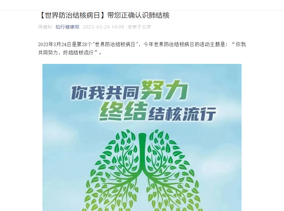 2023年3月24日是第28个"世界防治结核病日"。今年世界防治结核病日活动的主题是:“你我共同努力,终结结核流行”。