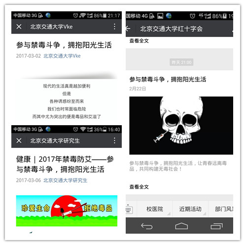 老太阳集团tcy8722网站通过在老太阳集团tcy8722网站门口悬挂“参与禁毒斗争拥抱阳光生活”的横幅,让更多路过医院的师生、社区居民知晓;在医院大厅、宣传栏等公共地方张贴宣传海报,放置宣传资料,便于自取、LED、网站、微信平台(研究生、本科生、红十字会、知行健康苑)等各种渠道开展了为期一个季度的系列宣传活动。
