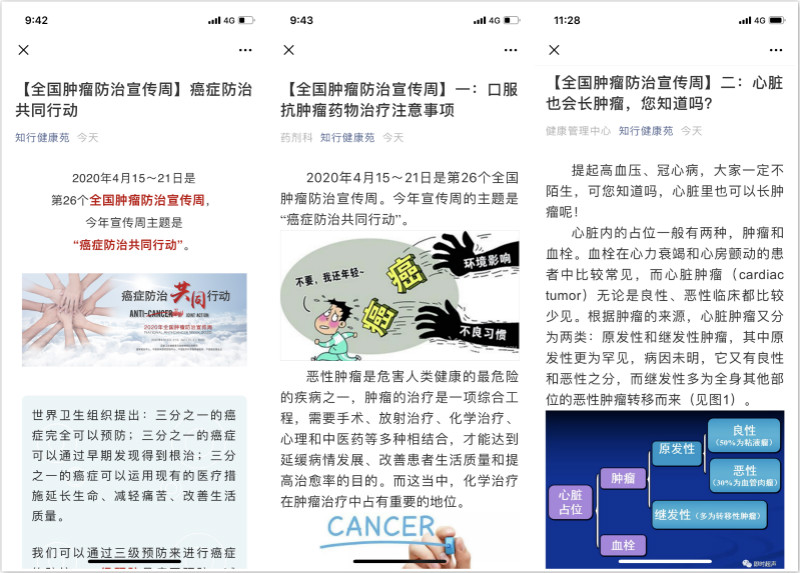 鉴于今年疫情的具体情况,围绕今年的活动主题,太阳网集团tcy8722社区卫生服务中心开展了一系列线上的宣传活动。首先,在门诊就诊区LED显示屏上循环播放防治肿瘤宣传周的信息。健康管理中心赵春丽医生撰写了关于癌症预防小贴士的宣传稿件,通过微博进行发布。同时我中心组织四位不同学科的医药专家撰写了关于肿瘤化疗药物使用注意事项、垂体催乳素瘤与月经不调、心脏肿瘤和鼻咽癌方面的稿件,排版印刷成健康列车进行发放,同时经过我院微信公众号“知行健康苑”和微博进行推送,向广大师生、教工和社区居民宣传肿瘤诊治的相关知识。