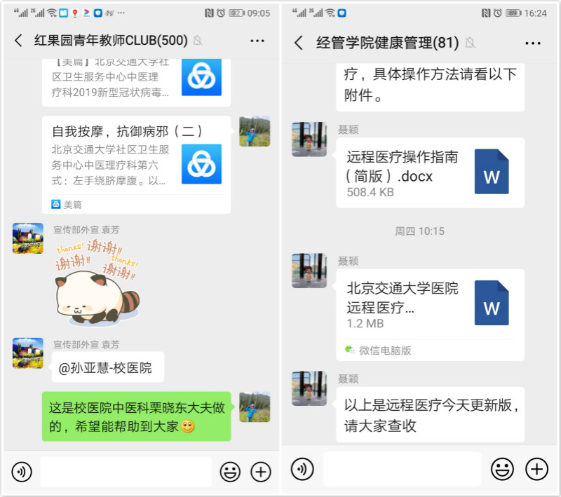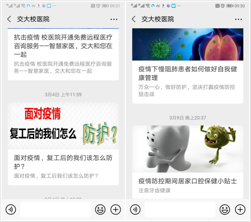 为了让更多的居民和师生及时了解宣教内容,中心各部门及时动脑筋、想办法,多渠道拓展宣传和信息报送工作。形式方面包括了传统的图文并茂的宣传稿件、微视频制作、动画制作、H5、美篇制作等等;内容方面涵盖了新冠肺炎基本知识、如何做好科学防控、疫情期间如何就医、居家期间如何做好自我健康管理、慢病患者疫情期间注意事项、中医防疫如何做、中医自我保健方法、疫情期间亲子关系如何相处、远程医疗和预约就诊如何操作等等。