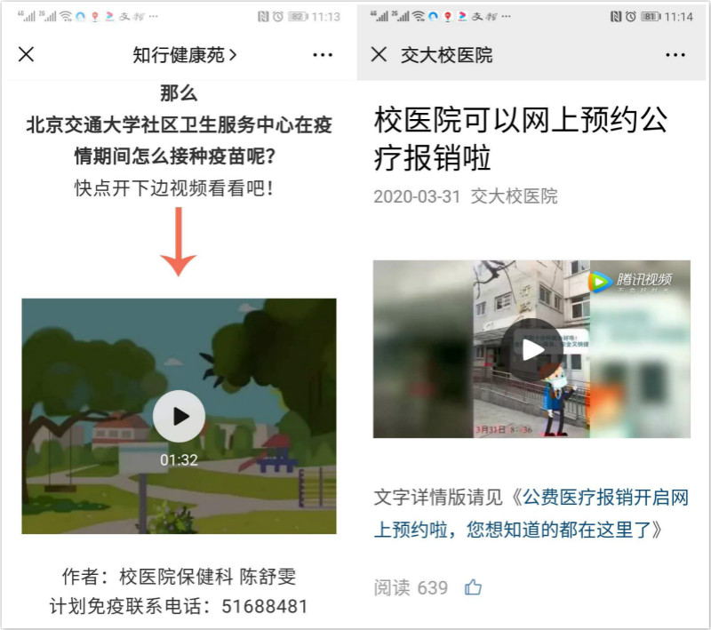 截止目前,我中心共发布健康宣教信息62篇,阅读量近2万人次;通过微博转发相关信息1500余条;通过学校师生邮箱发布信息 20余条,每次覆盖人群2万余人。为了增加健康知识的可读性,近期我们又集中力量开展各种小视频的制作,瞄准居民关注的问题,短小、精炼,每个视频1-2分钟。目前已经完成了计划免疫接种、公费医疗报销、安全就诊流程等内容,下一步将继续制作家医签约、各科室就诊注意事项等居民关注的视频。(孙亚慧)