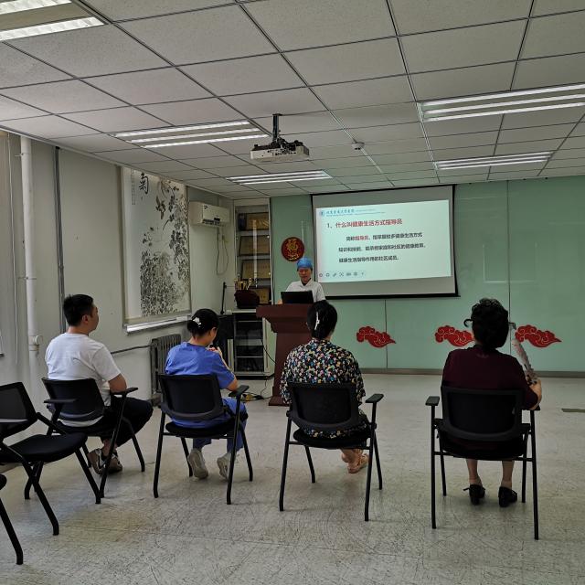首先,健康管理中心主任聂颖主任对指导员们做了动员。接着,主管指导员工作的李文影护士给居民们介绍了健康生活方式指导员职责,以“三减三健”(减盐、减油、减糖、健康口腔、健康体重、健康骨骼)活动为切入点,积极营造健康支持性环境,科学传播健康知识。她解读了<<健康生活方式指导员工作手册>>,讲解了“北京市健康生活方式指导员之家”微信平台的使用方法。指出,每位指导员需在“指导员之家”的“健康加油站”完成学习并参加考核颁发证书。